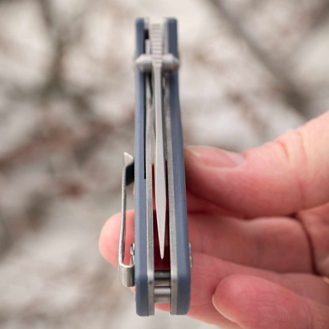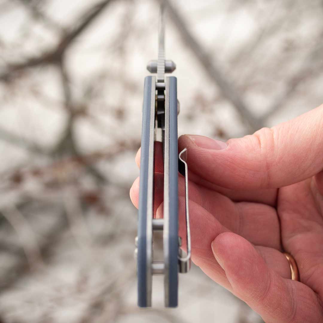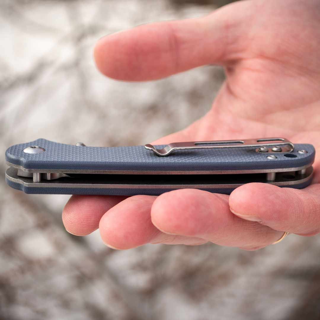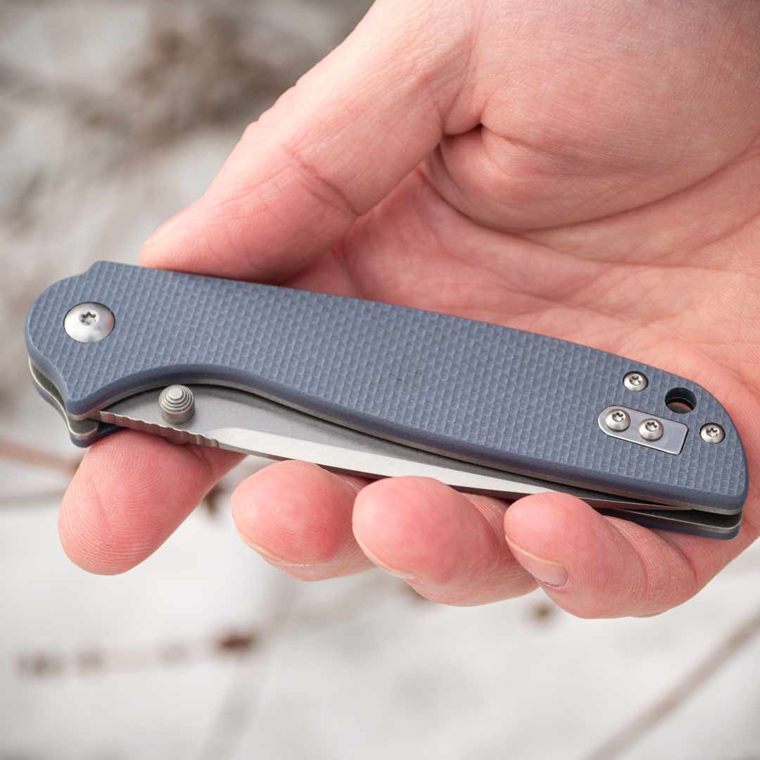 Рукоятка ножа виготовлена з композитного матеріалу G10 – склотекстоліту, що вирізняється високою зносостійкістю та міцністю. Завдяки ергономічній формі ручка зручна у використанні навіть при тривалому навантаженні. Текстуроване покриття забезпечує надійне зчеплення з долонею, не даючи ножу вислизнути навіть у вологих умовах. Кліпса з металу дозволяє зручно зафіксувати ніж на ремені, кишені чи спорядженні. Також є отвір під темляк.