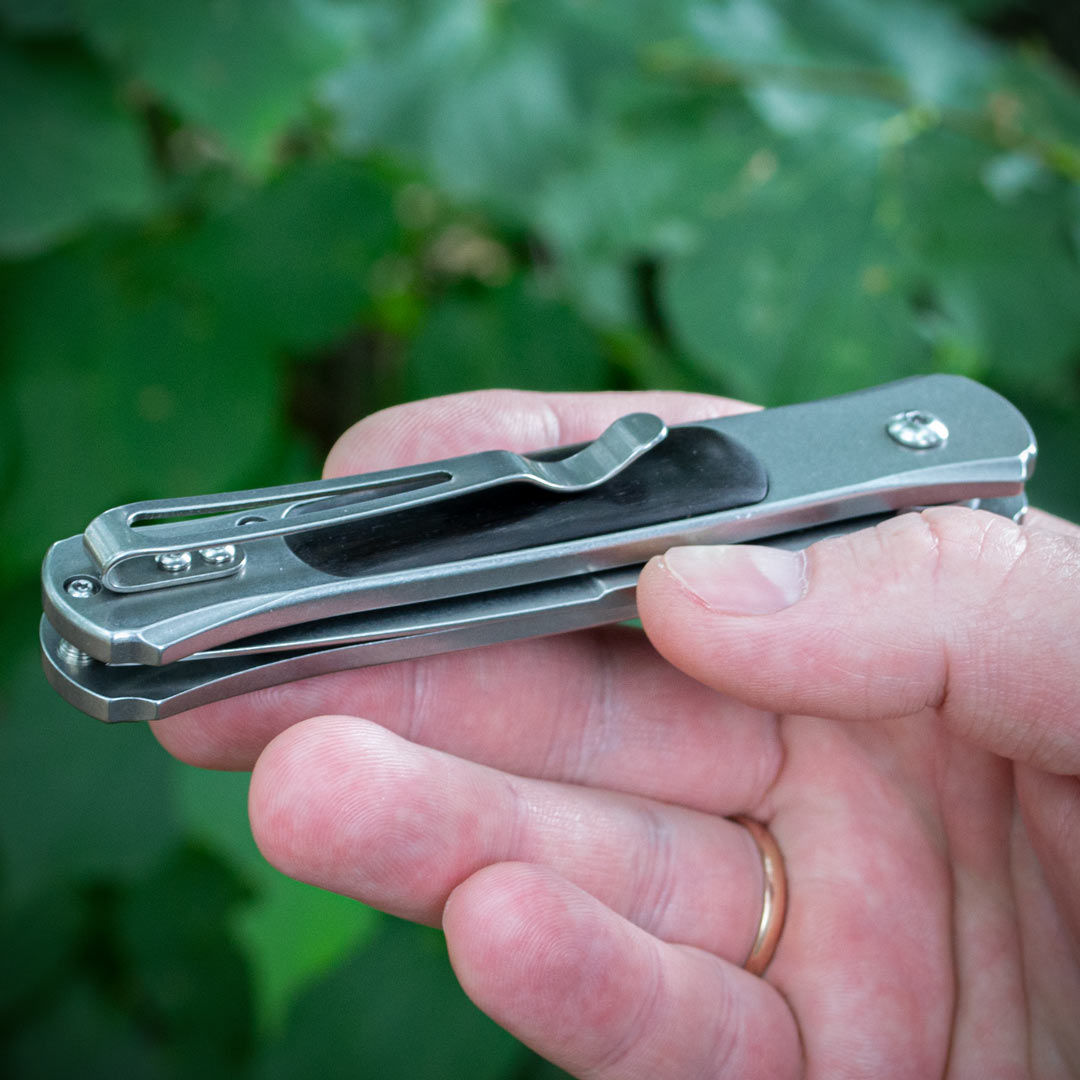 Клинок має класичну форму spear-point (списоподібний), яка відзначається універсальністю та ефективністю в різних завданнях – від туристичних до повсякденних. Його довжина становить 85 мм, а товщина біля обуха – 3,8 мм. Для виготовлення використовується високоякісна сталь 440C, відома своєю стійкістю до корозії та здатністю тримати ріжучу кромку протягом тривалого часу. Такий матеріал дозволяє довго обходитися без додаткового заточування навіть при активному використанні.