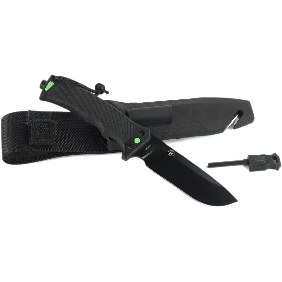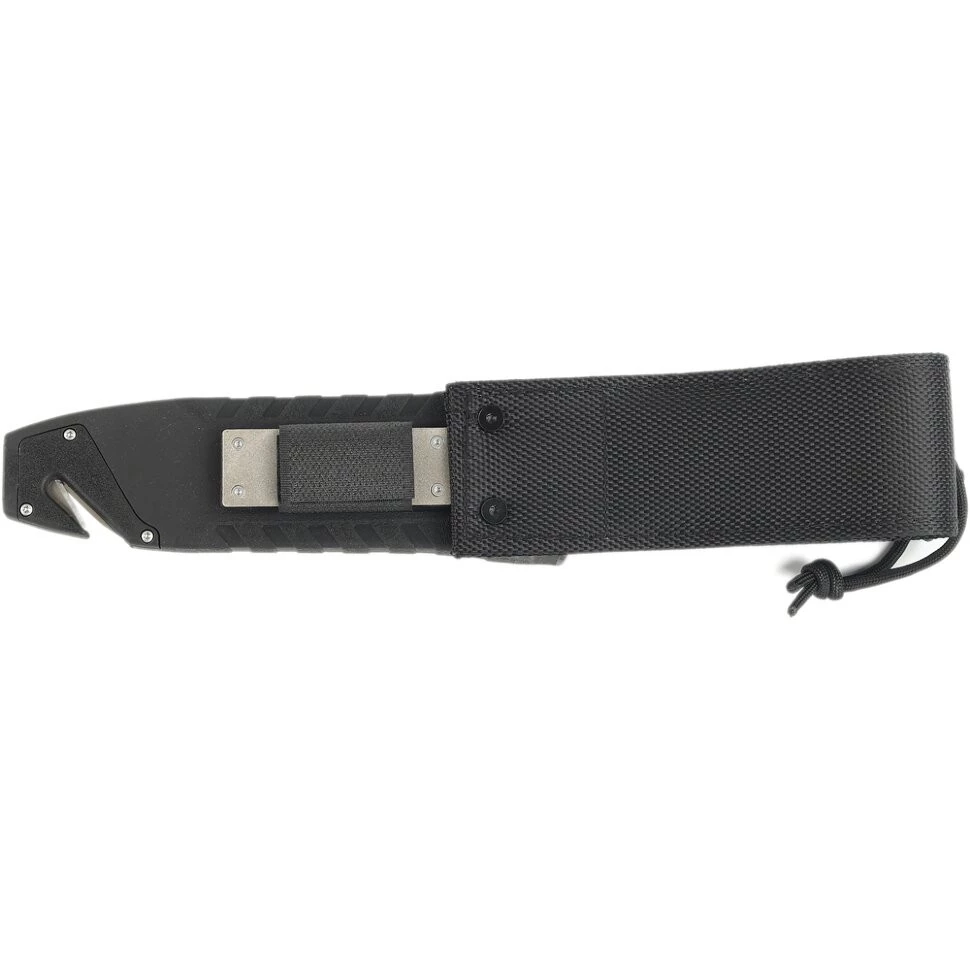 Особливу увагу приділено чохлу: він зроблений з поєднання пластику та нейлону й оснащені додатковими елементами. У комплект входить кресало для розведення вогню, стропоріз та невелика пластина для заточування, яка стане в пригоді у польових умовах. Крім того, ніж обладнаний отвором під темляк і продається разом із міцним паракордом, який можна використовувати для фіксації або в господарських цілях.