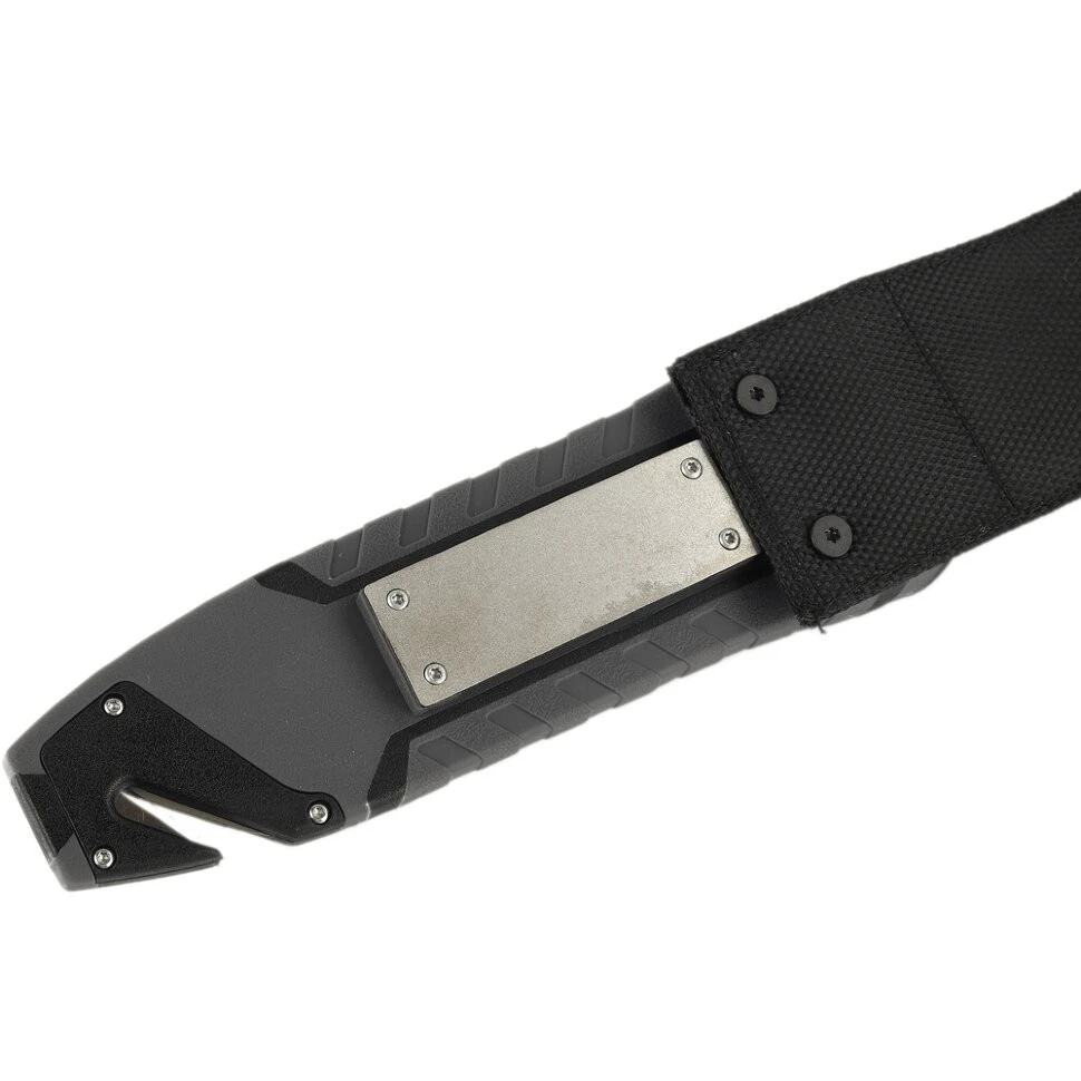 Особливу увагу приділено чохлу: він зроблений з поєднання пластику та нейлону й оснащені додатковими елементами. У комплект входить кресало для розведення вогню, стропоріз та невелика пластина для заточування, яка стане в пригоді у польових умовах. Крім того, ніж обладнаний отвором під темляк і продається разом із міцним паракордом, який можна використовувати для фіксації або в господарських цілях.