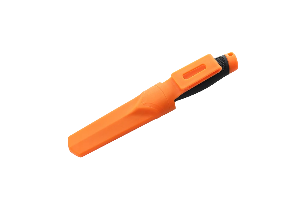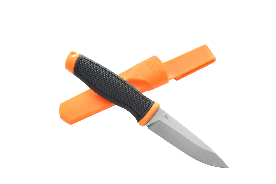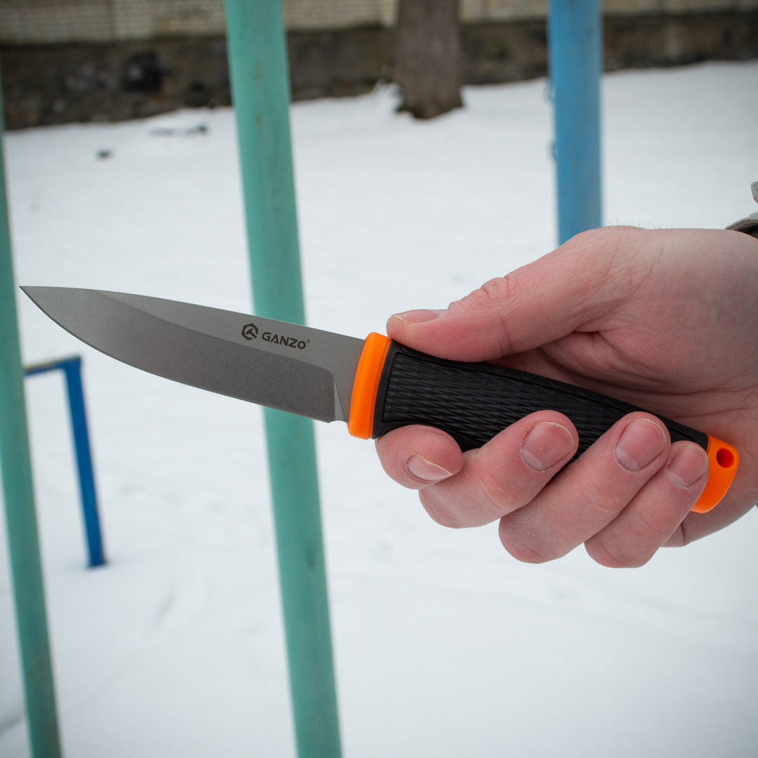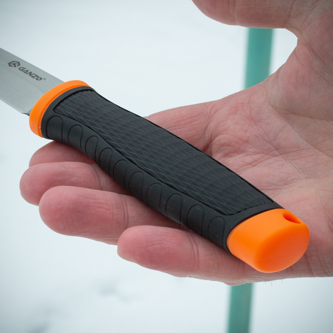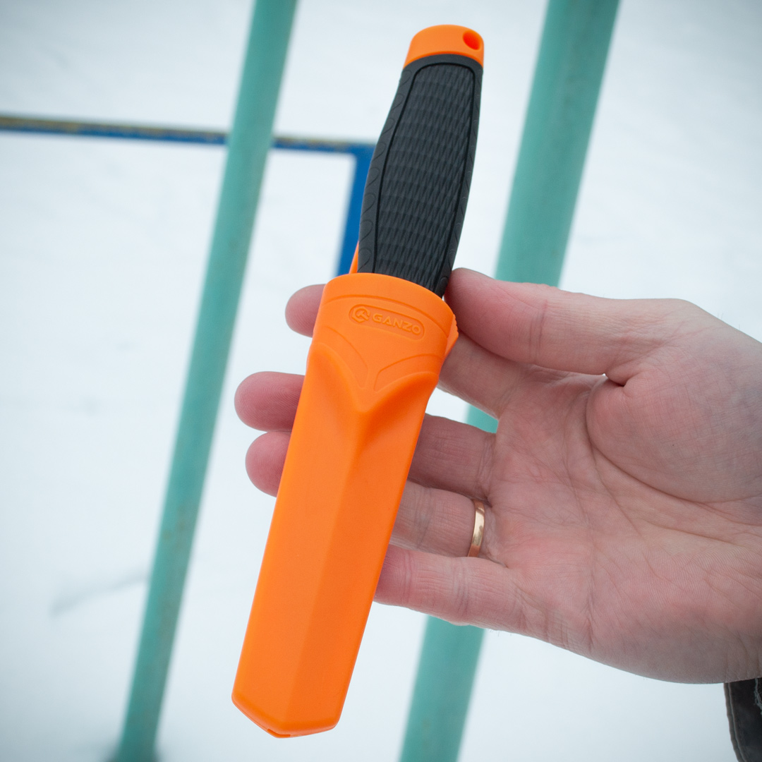 Ергономічна рукоятка зроблена з матеріалу ПП+ТПР. ТПР або термопластична гума – це синтетичний полімер, що має властивості гуми та пластику. У рукавичках він використовується як шар, що захищає руку від ударних впливів – здатний поглинати та розсіювати енергію удару. Працювати таким ножем безпечно та зручно. Піхви поліпропіленові.