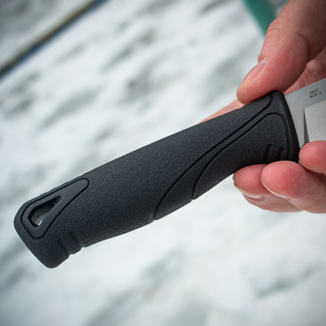 На кінці руків’я знаходиться отвір для темляка, що виконує роль страховки під час активного використання ножа. Це дозволяє запобігти випадковому вислизанню інструмента з руки.