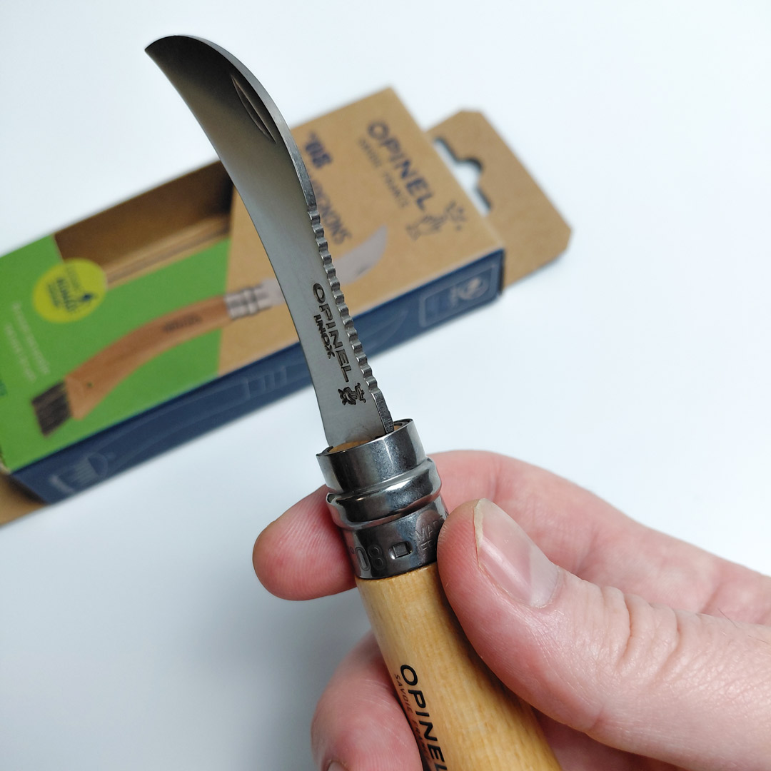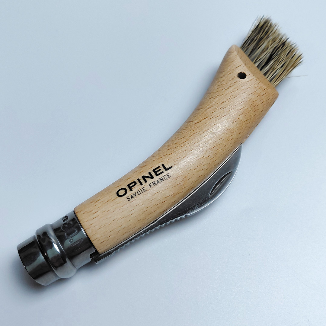 Виробник Opinel створив модель, спеціально призначену для грибників — складний ніж грибника Opinel №8. Його вигнуте лезо ідеально підходить для зрізання грибів різних розмірів, а дрібні зубці та щіточка на кінці рукоятки дозволяють швидко очистити їх від землі, моху та іншого бруду. Рукоять виготовлена з бука, що забезпечує комфортний і надійний хват. Конструкція оснащена фірмовим замком Virobloc, який блокує лезо в закритому чи відкритому положенні, запобігаючи випадковому складанню чи відкриванню ножа під час транспортування.