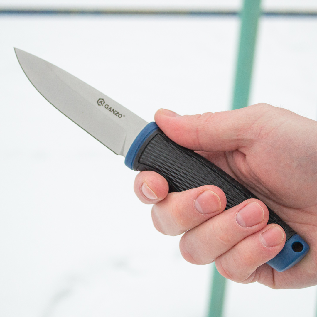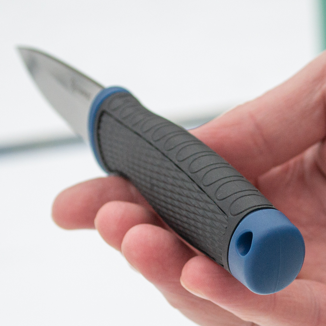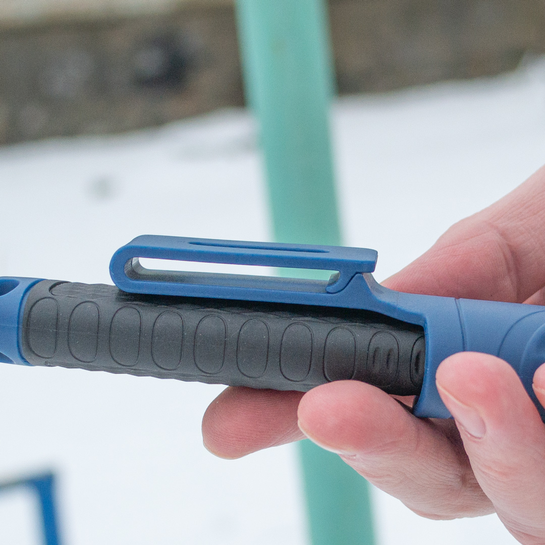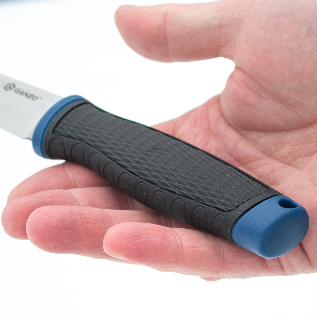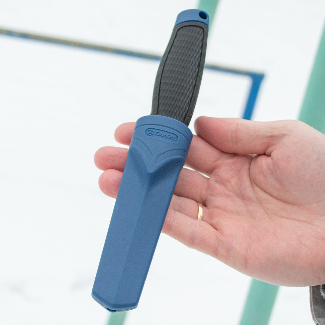 Ергономічна рукоятка зроблена з матеріалу ПП+ТПР. ТПР або термопластична гума – це синтетичний полімер, що має властивості гуми та пластику. У рукавичках він використовується як шар, що захищає руку від ударних впливів – здатний поглинати та розсіювати енергію удару. Працювати таким ножем безпечно та зручно. Піхви поліпропіленові.